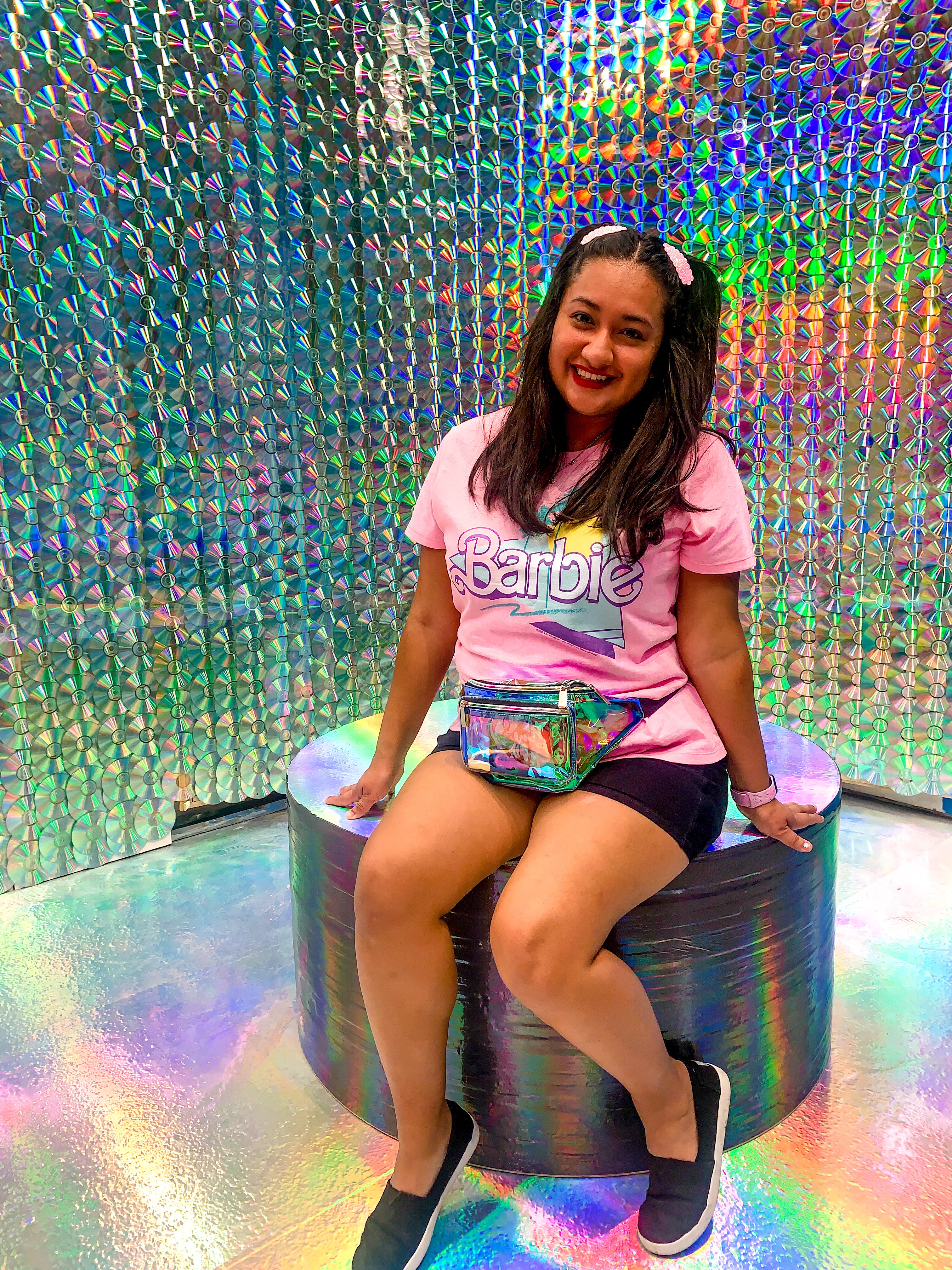This pop up experience is located in the Westfield Topanga Mall & has several colorful rooms that literally take you in a time machine back to the 90s. Briella and I got dressed up for this event last minute. I was able to find a fanny pack and Barbie shirt last minute on Amazon. I will link those, but I literally grabbed something quick from Briella’s closet since she came with me last minute. If you dress up it is a lot more fun to get into character.
