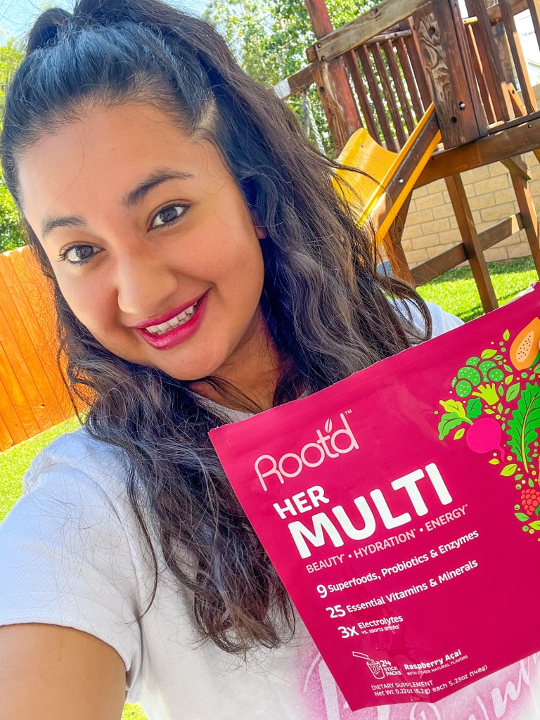 The perfect addition to my daily routine is this little packet! It’s called HER Multi from Rootd and contains all the vitamins and electrolytes you need! It’s such a gain because you get not just one but multi benefits including your beauty, health & energy in this little packet. The best part is that it contains zero sugars or any added sugar! I also love how easy I can carry the little packets around in Briella’s backpack or my purse.